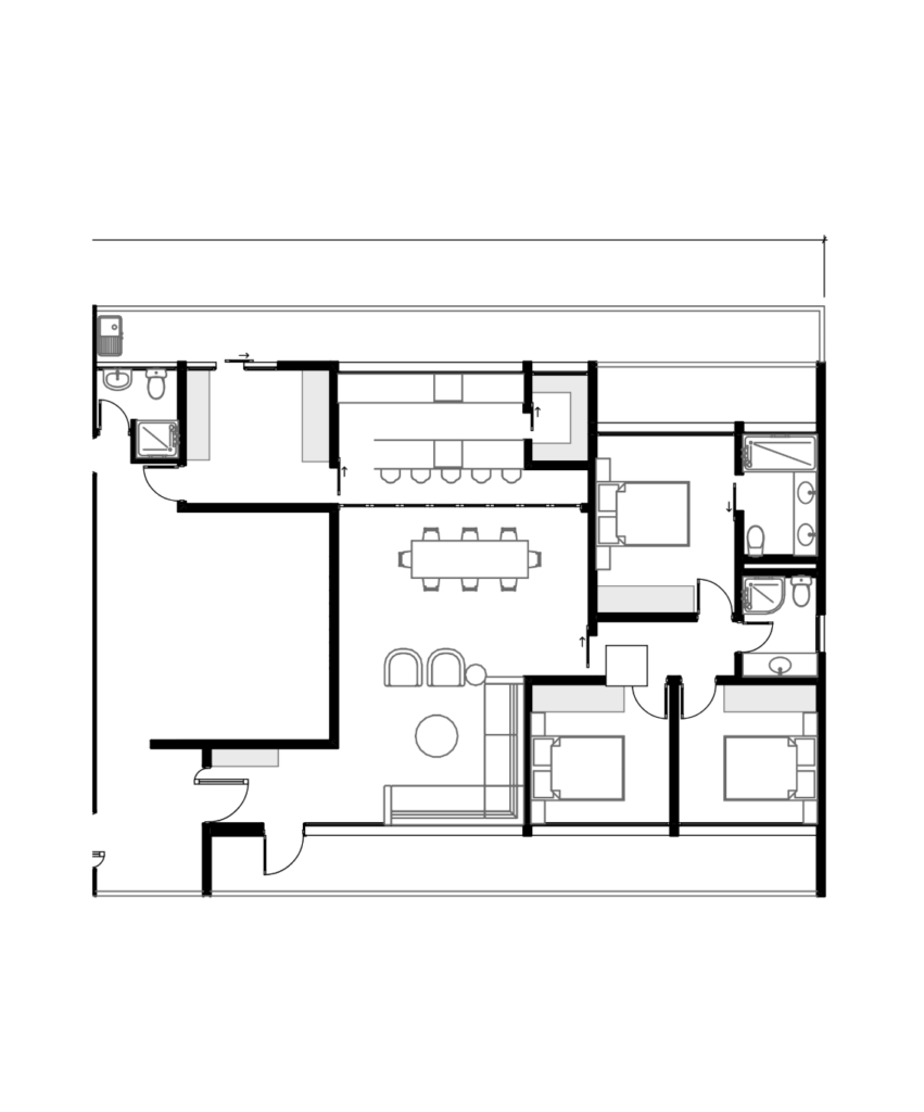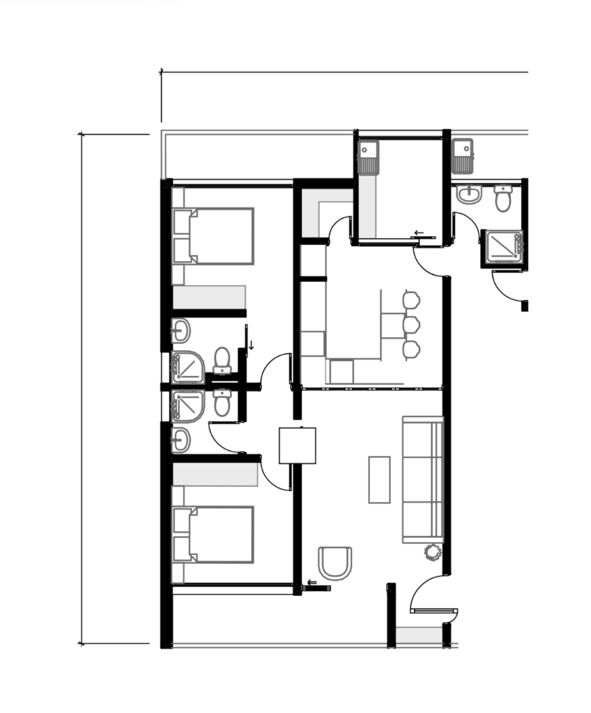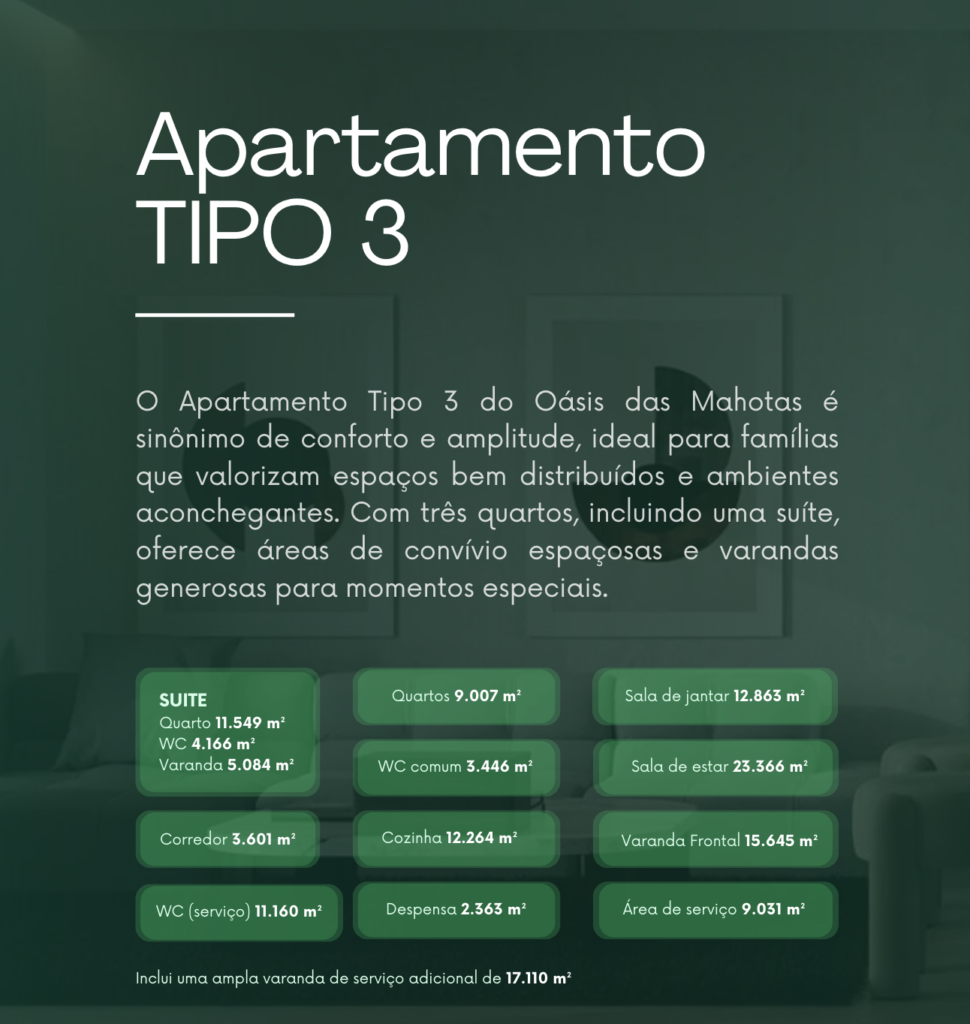 Tipo 3 (T3) – 130 m² de área privada com suíte, dois quartos, sala de estar e jantar separadas, varanda frontal e traseira, além de área de serviço com WC adicional.
